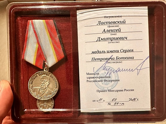 Министр здравоохранения Российской Федерации Михаил Мурашко вручил медаль им. С.П. Боткина Алексею Ластевскому — эта почётная награда предназначена практикующим врачам с более чем 10-летним стажем работы и уже имеющим другие ведомственные награды за заслуги в сфере здравоохранения.