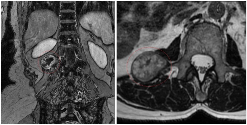 Магнитно-резонансная томография выявила паравертебральное (расположенное рядом с позвоночным столбом) объёмное образование размером около 3×4х3 см на уровне L1-L2 позвонков справа. Пациентка обратилась к врачу-нейрохирургу ННИИТО им. Я.Л. Цивьяна.